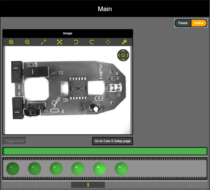 - A Trigger Once Button to perform a single acquisition when the job is Paused, and a Go To... Button leading to the Cam<X>Setup web page.