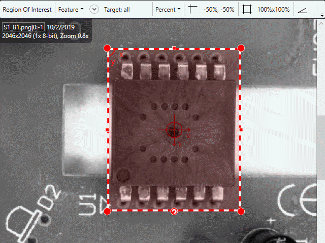 After Cognex ViDi Tools are added, you will need to adjust the Region of Interest (ROI) to define the View that the tool will operate within. You can adjust the size and placement of the ROI using the graphic handles in the image. This allows you to re-size the ROI, and to move it within the image.