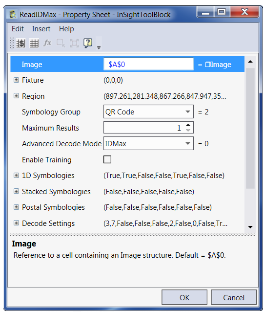 - Insert a Pattern Match function into the spreadsheet. The Property Sheet automatically opens. The Image parameter value is $A$0, referencing the default image source, cell A0.