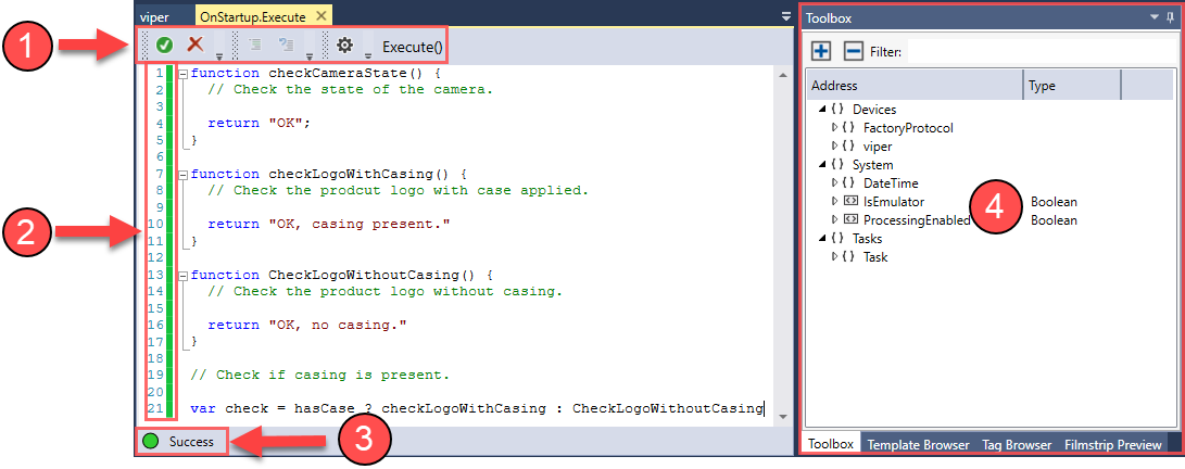 : Validates the current script. If no syntax errors are detected, the status bar (2) and the validation indicator (3) turns green. In case of errors, they turn red. Hotkey: F6.
