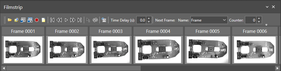 The Filmstrip window allows you to record, load, play or save sets of images (called "frames") within the In-Sight ViDi adapter on your PC, and then use the recorded frames to simulate image acquisition.