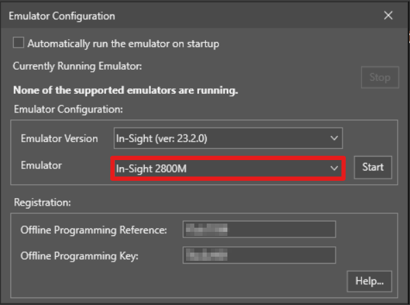 If you want to set the emulator so that it automatically starts when In-Sight Vision Suite is launched, check the Automatically run the emulator on startup checkbox, and then press the Start button.