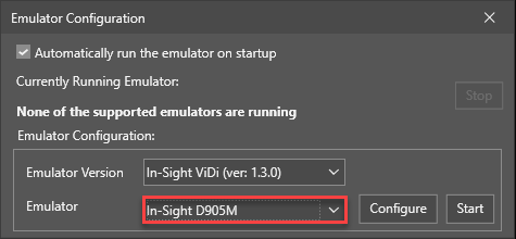 If you want to set the emulator so that it automatically starts when In-Sight Vision Suite is launched, check the Automatically run the emulator on startup checkbox, and then press the Start button.
