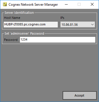 Tip:Take note of these settings, as you will need them to configure the HTTPS connection with the Configure Secure Connection utility of In-Sight Vision Suite. After installation, you can reset the password to 1234 in the Service Control tab of the software, if needed. The IP address of the CNS, on the other hand, can be checked in the Server Identification tab later.
