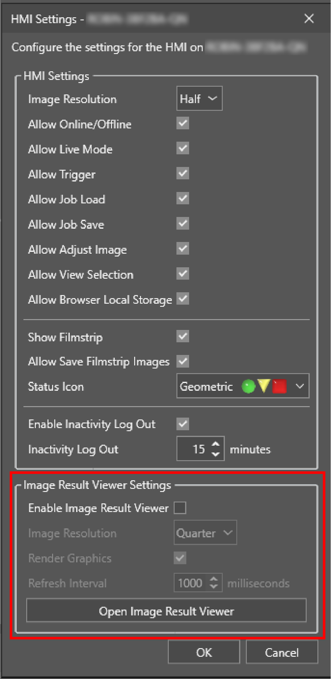 The HMI Settings utility also allows you to configure the Image Result Viewer. For more information, see the Image Result Viewer section in one of the following documents: In-Sight EasyBuilder Help, In-Sight Spreadsheet Help, In-Sight 3D EasyBuilder Help, or In-Sight 3D Spreadsheet Help, which can be found on the Cognex Support Site.