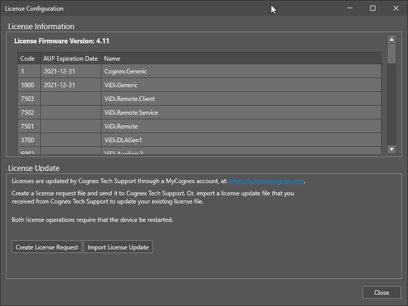 - The License Update section, allowing you to change the current license of your device by generating a license update request, sending it to Cognex Support, and then updating your vision system with a license update file.