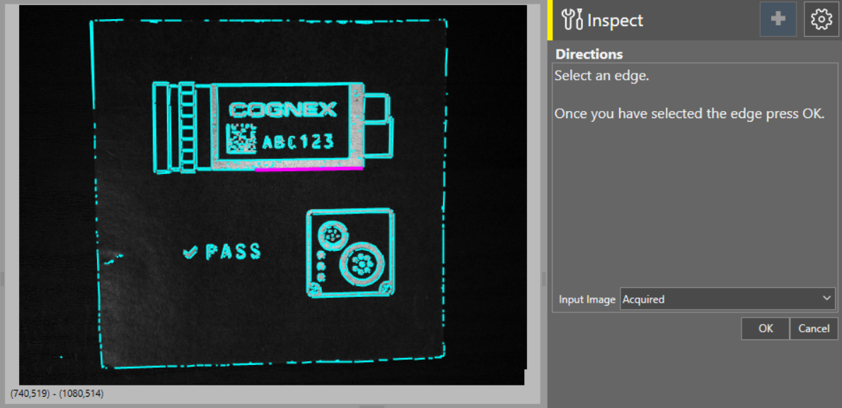 - The tool automatically finds edges on your image, and highlights them in cyan on the acquisition Acquisition is the process or result of the vision system acquiring a new image. display screen. Click on a highlight to select it as the edge you want the tool to find.