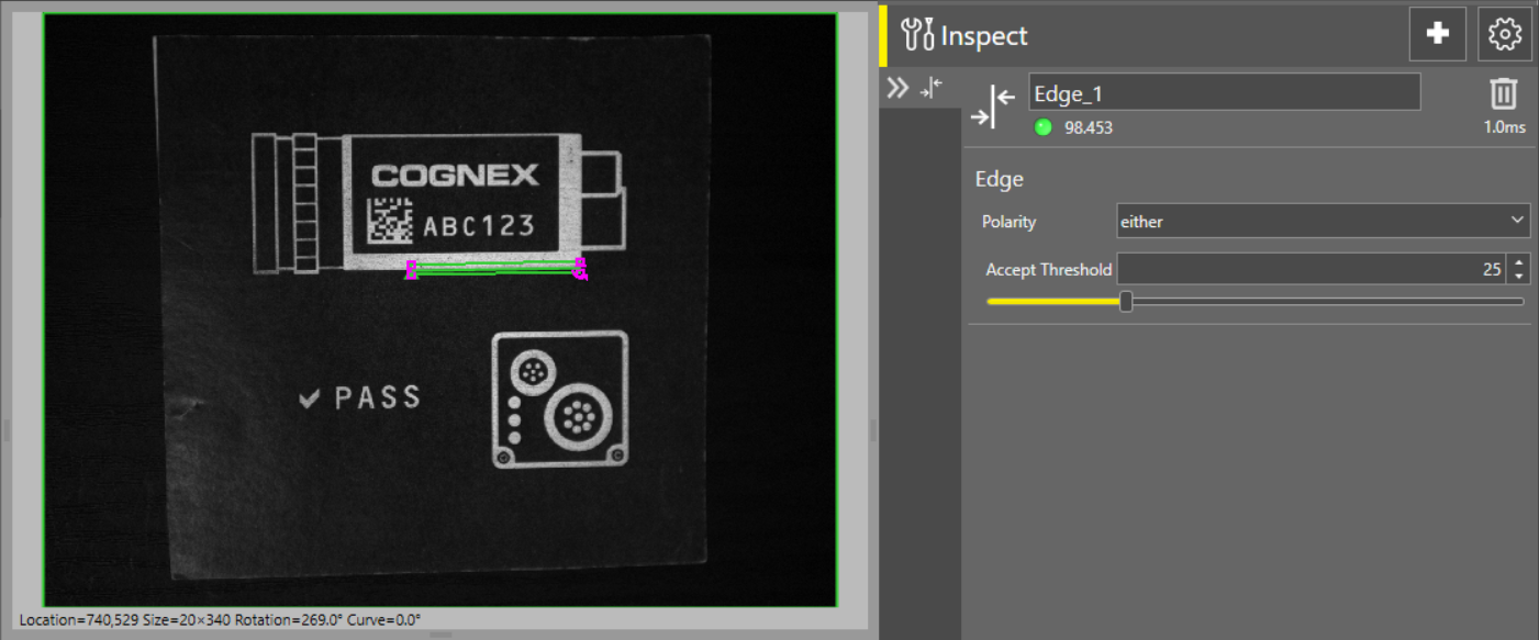 The Find Edge tool allows you to determine the presence or absence of a linear edge. The Find Edge tool is able to identify linear edges much quicker than a Find Pattern tool.