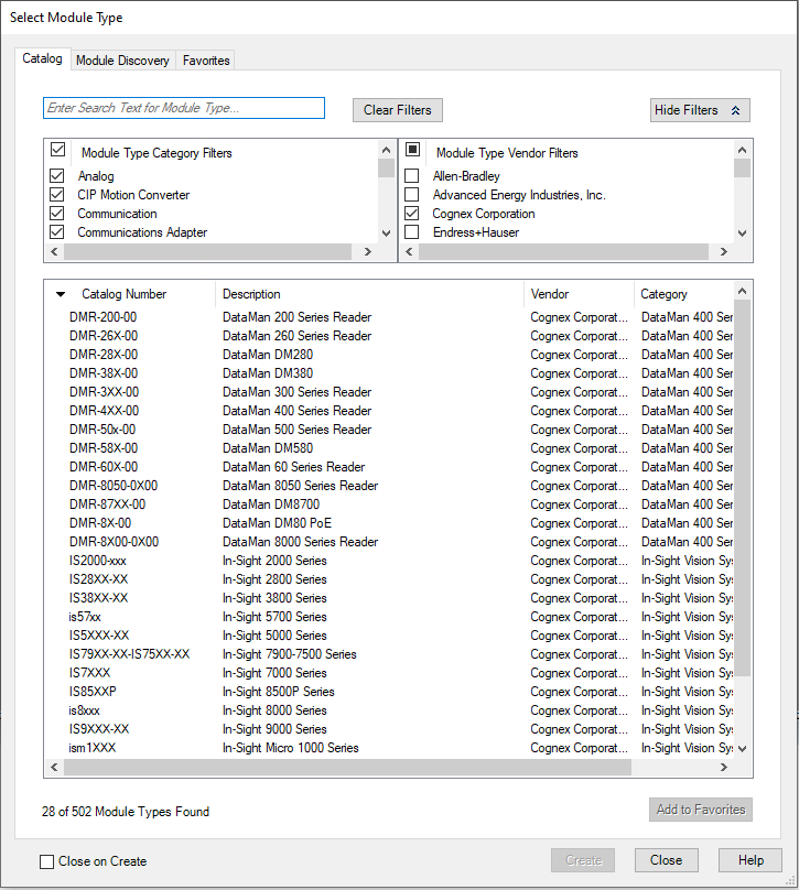 In the Select Module Type dialog, select the type of In-Sight vision system that you connect to the PLC and click Create.