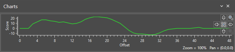 - The Score axis is defined by the Score (100 and -100) and the Accept Threshold parameter set for the tool. Peaks (or positive scores) indicate that the edge transitions from dark to light, while valleys (or negative scores) indicate that the edge transitions from light to dark (a score of 0 indicates no edge was detected).