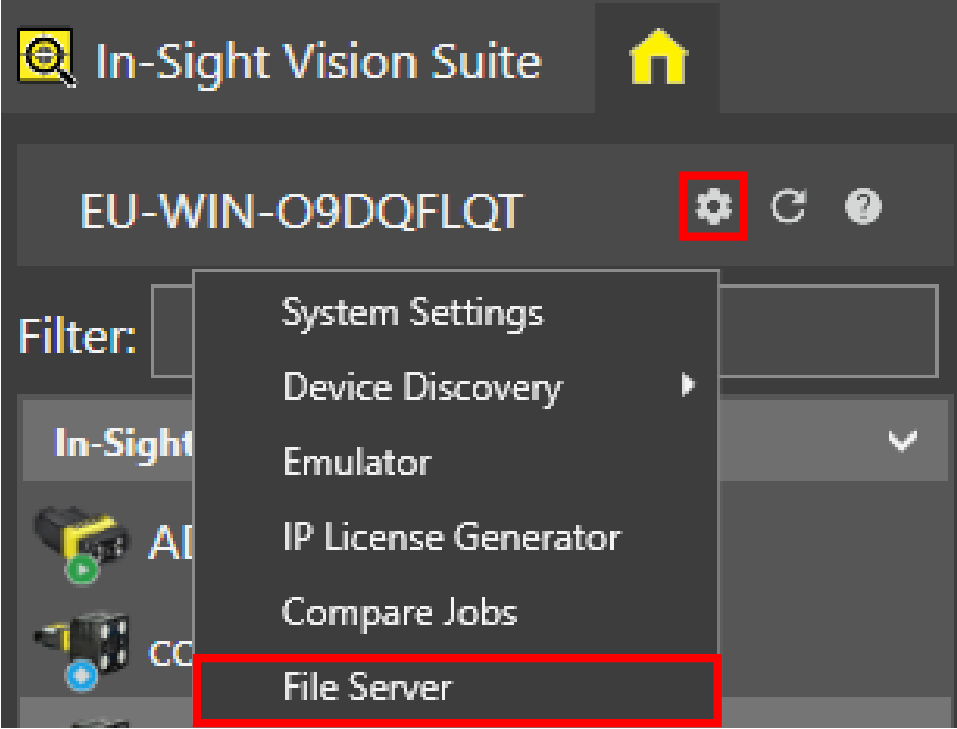 Open the System Settings dropdown menu by clicking on the cogwheel icon at the top of the device list, and click File Server.