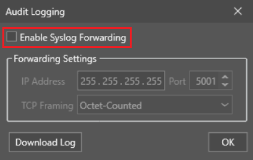 Click Enable Syslog Forwarding to enable sending the audit log to a remote server.