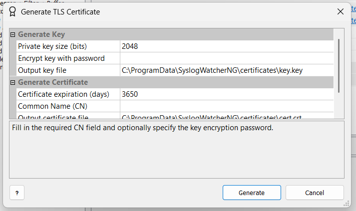 Enter the name of your computer in the Common Name (CN) field, and click Generate.