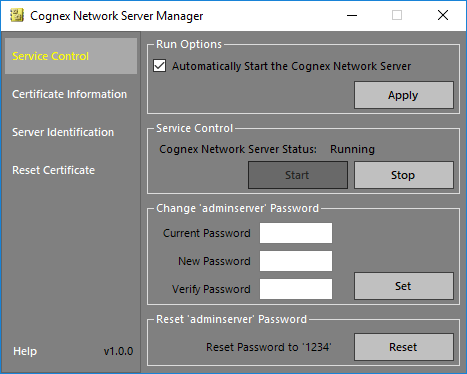 Tip:Take note of these settings, as you will need them to configure the HTTPS connection with the Configure Secure Connection utility of In-Sight Vision Suite. After installation, you can reset the password to 1234 in the Service Control tab of the software, if needed. The IP address of the CNS, on the other hand, can be checked in the Server Identification tab later.