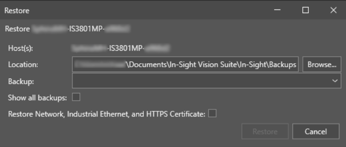 - By default, the Backup setting of the Restore utility shows only the backup(s) that were created on the currently selected vision system. If you want the drop-down menu to list all backups stored in the <X>:\Users\[username]\Documents\In-Sight Vision Suite\Backups folder (including the compatible backups of other vision systems), check the Show all backups setting. This is useful if you want to use the backup of another vision system to quickly configure the currently selected device. When this option is enabled, the drop-down list shows the available backups in the following format: <Device Network Name> <Backup Date> <Backup Time>.