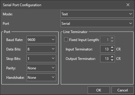 | Output Terminator | Determines the output terminator value for the line terminator. The default value is 13. The maximum value is 255. | ||||||||
