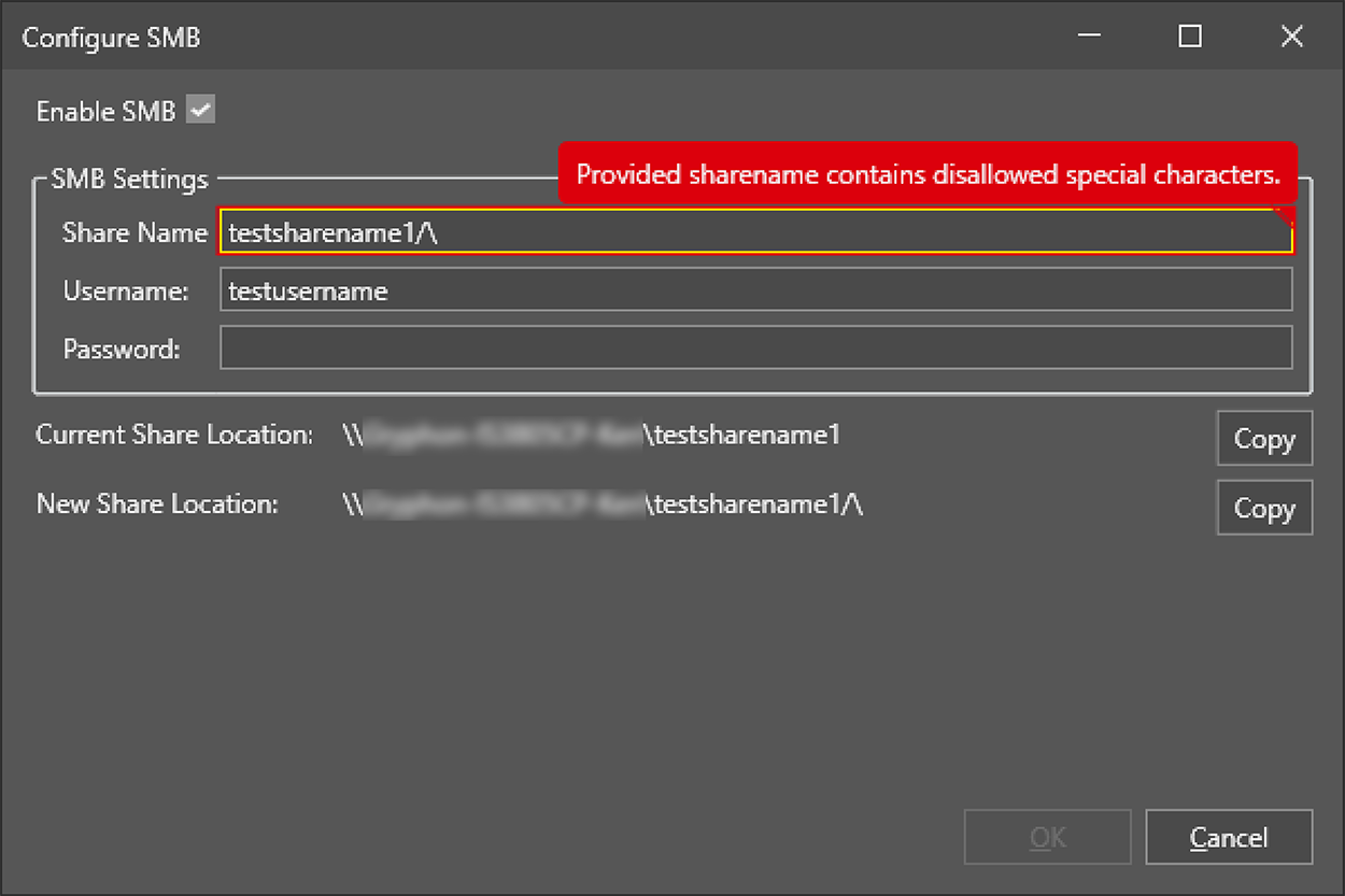 A warning message appears if you use an invalid character in the share name:
