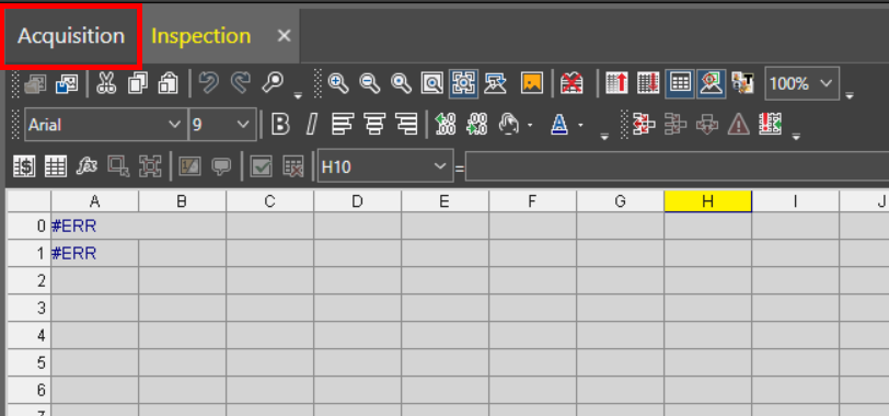 The Acquisition Acquisition is the process or result of the vision system acquiring a new image. panel allows you to adjust the settings for point cloud A point cloud is a 3D structure that consists of the data points collected by a 3D vision system during acquisition. acquisitions. To open the Acquisition panel, click on the Acquisition tab above the Spreadsheet toolbars.