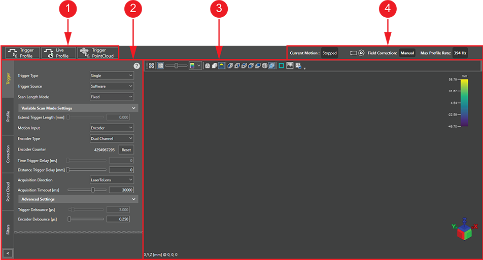 | 3 | Acquisition display | The acquisition display shows the latest 3D point cloud acquisition. |