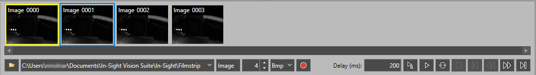 The Filmstrip allows you to record, load, and play back sets of images called frames within the In-Sight Spreadsheet adapter on your PC, and then use the recorded frames to simulate image acquisition. The captured frames can illustrate valid or defective parts, or can show errors such as false accepts or rejects. The different frames make the tool useful for testing, debugging, and validating your application.