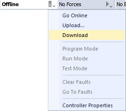 In RSLogix, click the dropdown arrow on the Offline button, and click Download.
