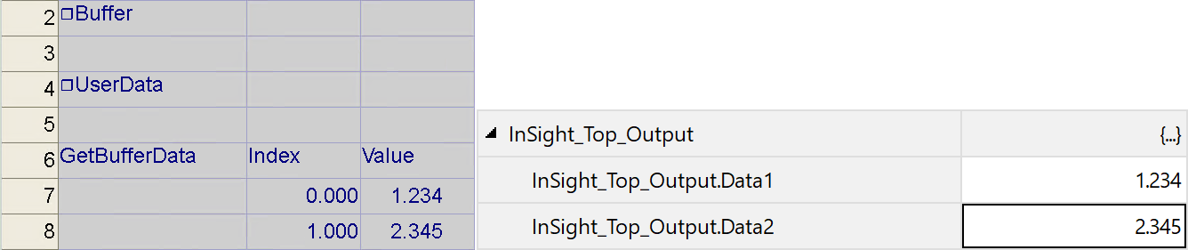 Right-click an empty cell and insert the GetBufferData function into the spreadsheet. Set the ReadBuffer parameter of the GetBufferData function as a cell reference to the recently created ReadUserDataBuffer function. The index parameter of the GetBufferData function determines which data value in the FormatInputBuffer to reference. For example, if you set the index parameter to 0, the first floating-point data value in the FormatInputBuffer returns. If you set the index parameter to 1, the second floating-point data value in the FormatInputBuffer returns.