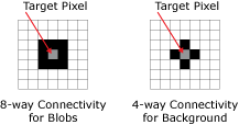 The DetectBlobs function performs a form of blob analysis known as "connectivity analysis" on a Region of Interest (ROI). During "connectivity analysis", the pixels within the ROI are divided into two categories, Blob or Background. During this process, the pixels are examined to determine whether or not they are connected to their neighboring pixels. For a more in-depth description, see Blob.