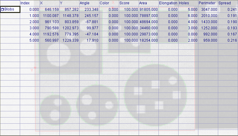 The values returned in the result table can be used to filter and sort the blobs, using the FindBlobs and SortBlobs functions. For example, a FindBlobs function could be inserted into the spreadsheet and reference the DetectBlobs function. The FindBlobs function would then be used to filter the blobs based upon their Spread. Then a SortBlobs function could be inserted into the spreadsheet and it could reference the recently created FindBlobs function to sort the list of blobs based upon their X, Y position.