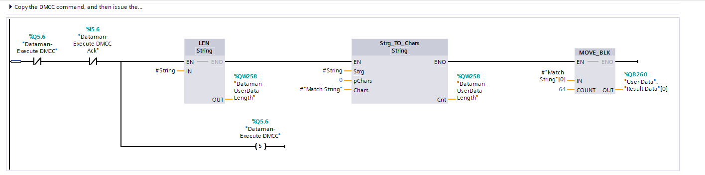 The process of executing a DMCC command is the same for all other SoftEvents (see example above) except the step of invoking the SoftEvent also includes copying the command string to the User Data Module. In this example the command string is exists in a Data Block. This example can be expanded to utilize a Data Block with an array of command strings that the copy function can reference by an index value. This allows the user to pre-define all DMCC commands that are required by the application and invoke them by index.