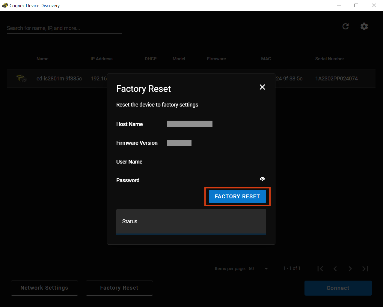 You can reset your vision sensor through Cognex Device Discovery Utility by clicking Factory Reset.