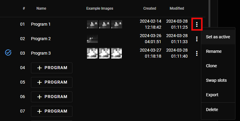 In the Program Management tab of Settings, you can see information about and actions relating to your programs. A blue checkmark appears next to the current active program. The following actions are available by clicking on the three dots next to each program: set as active, rename, clone, swap slots, export, or delete the program. When cloning a program, the program name is kept by default and you can change this in the cloning window. Multiple programs can have the same name.