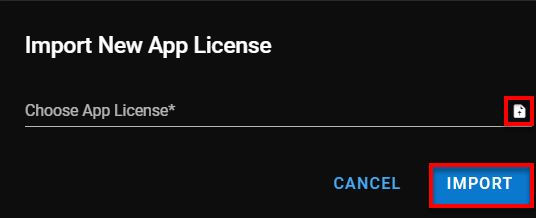 Haga clic sobre el icono de cargar y se abrirá el explorador de archivos. Cargue la nueva licencia de la aplicación desde su PC y haga clic sobre Importar.