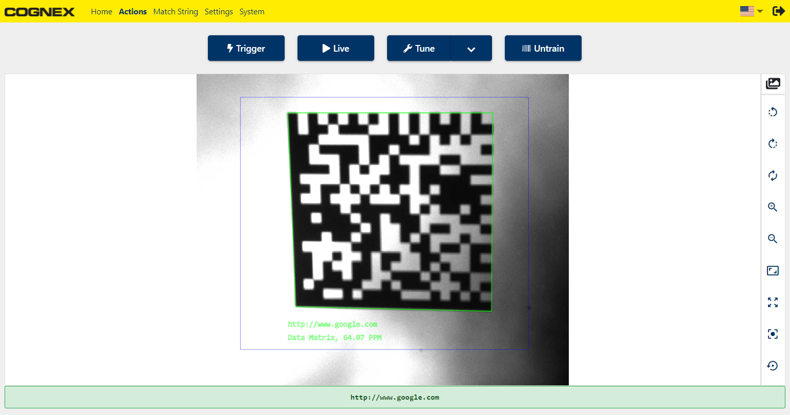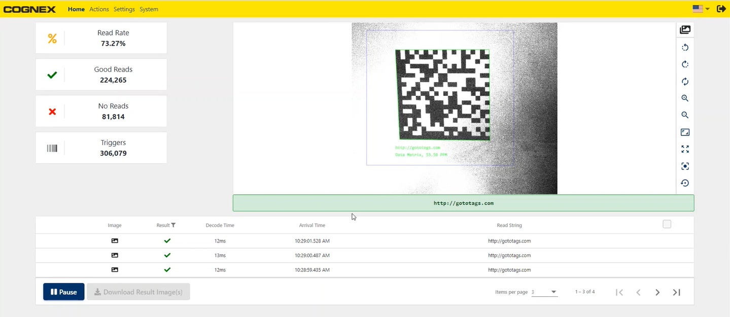 The DataMan WebHMI provides a live view of reads, results and statistics, and allows you to pause the feed and scroll back to analyze or download individual result images. You can manually trigger or tune readers and adjust reader settings from the DataMan WebHMI.