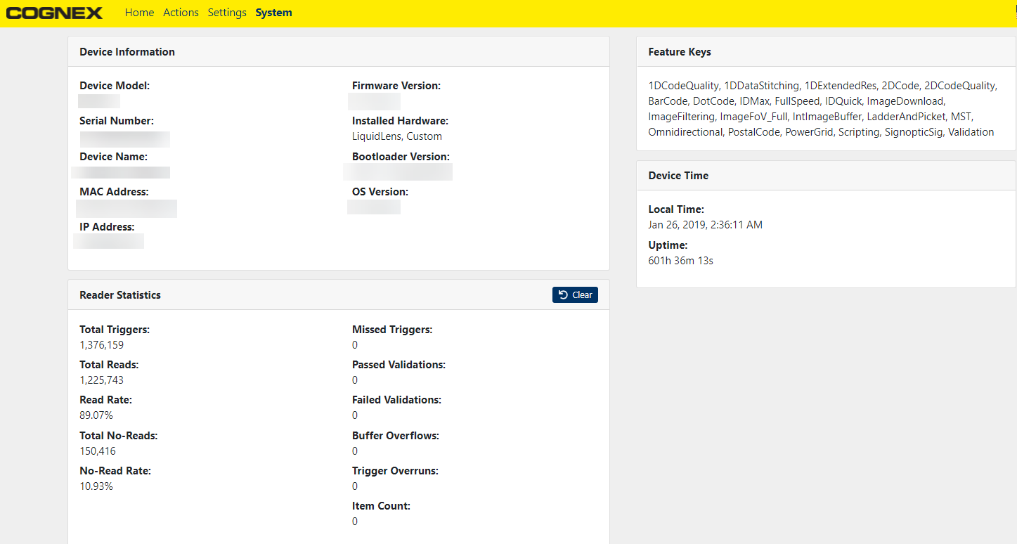 The System page of the DataMan WebHMI displays detailed reader information, reader statistics, feature keys, and reader time.