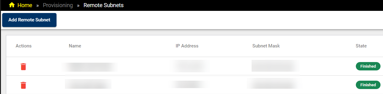 To remove a remote subnet from the list, click on the Bin icon in the Actions column of the row for the selected subnet.