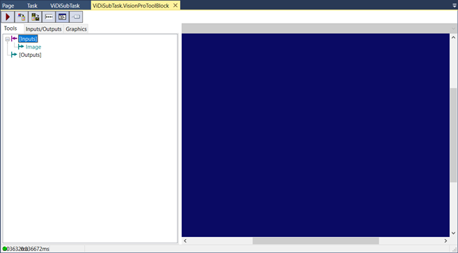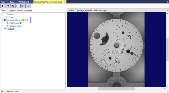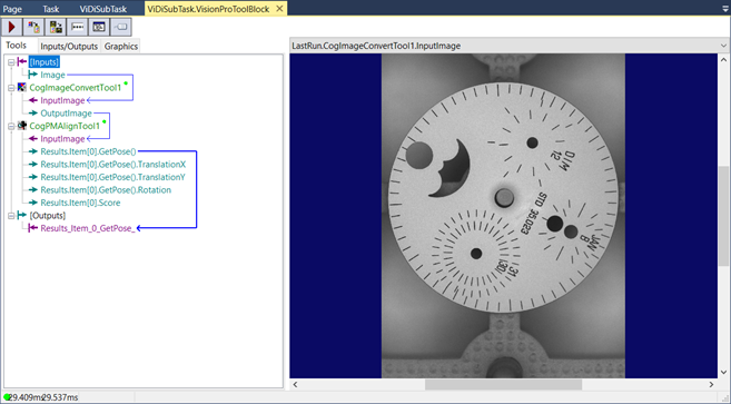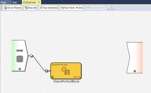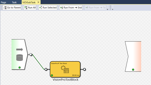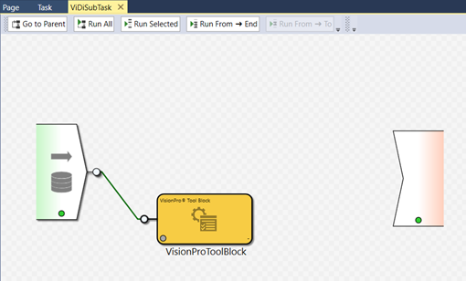 Drag and drop the VisionPro® Tool Block into the ViDi Sub Task, and then connect the image pin to the input pin of the VisionPro® Tool Block.