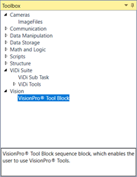 Working within the ViDi Sub Task block, from the Task Toolbox, open the Vision node and select the VisionPro® Tool Block.