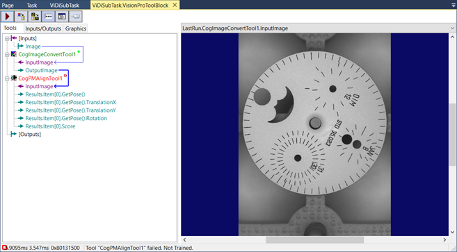 Within this application scenario, a VisionPro® Tool Block will be used to find a specific feature in the image, and then output a pose, which is a transform that will be used by a ViDi tool to orient its search area.