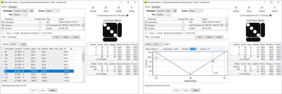 パラメータ検索アプリケーションは、パラメータ設定を繰り返し組み合わせて最適な値と組み合わせを調べることができる独立したユーティリティです。パラメータと設定の選択全体で自動的にグリッド検索を実行します。ワークスペースと、特徴のサイズやスケールパラメータなど、いくつかの重要なパラメータを選択し、パラメータごとに値のセットを定義してから検索を開始します。ユーティリティによって、ツールの学習および処理パラメータのすべての組み合わせが実行されます。複数の GPU がある場合は、GPU でツールが並列実行されます。実行が完了したら、各実行結果がデータベースサマリおよび対話型グラフによって評価されます。