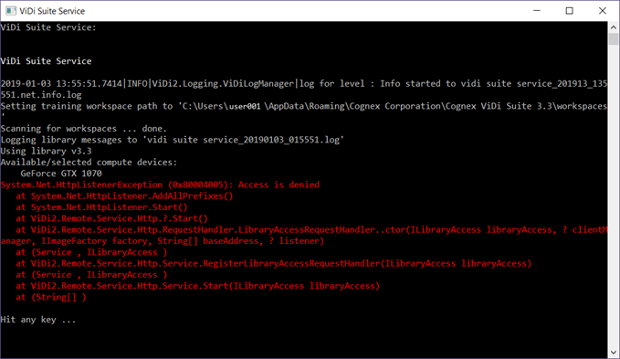 2. Launch the ViDi Suite Service application to determine what port number the service will be using, which will be indicated by the "Listening at http://localhost:PortNumber" line (where "PortNumber" will be the port number assigned to the service, e.g. 8080) after the service starts.