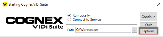 At the Starting Cognex ViDi Suite screen, press the Options button.