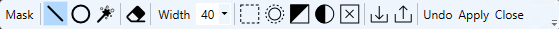 La barra de herramientas Máscara se inicia haciendo clic con el botón derecho del ratón en una imagen y seleccionando Editar máscara en el menú. Después de aplicar la máscara a una imagen, haga clic en el botón Aplicar para que todas las imágenes de su conjunto de imágenes de entrenamiento usen la máscara. Pulse el botón Cerrar para volver al proceso de construir su aplicación ViDi.