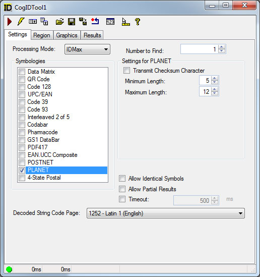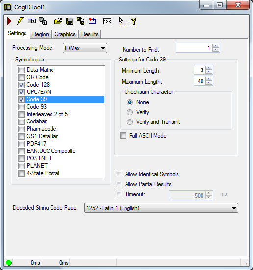 Use the Settings tab to select which symbology the tool will use to decode symbols and set other run-time parameters. The following figure shows an example Settings tab: