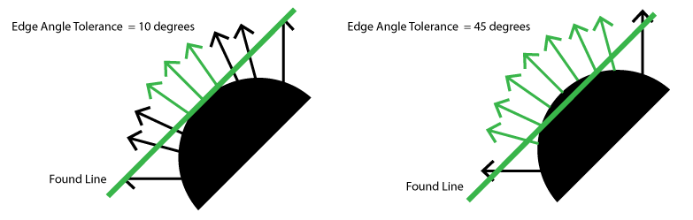 As you increase the edge angle tolerance, you allow the tool to consider more edge points as inliers and change the location of the found line, as illustrated in the following figure: