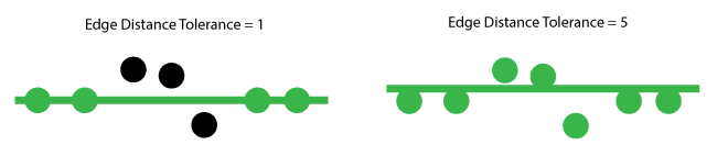 As you increase the edge distance tolerance, you allow the tool to consider more edge points as inliers and change the location of the found line, as illustrated in the following figure: