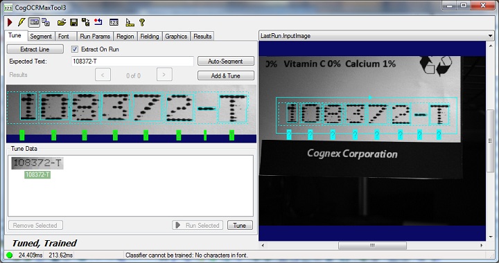 Use the Tune tab to build an OCRMax font and use the auto-tuning capabilities supported by the tool to automatically determine the best segmentation parameters for identifying the characters in successive images. The following figure shows a sample Tune tab:
