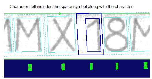 Be aware that the parameters you choose allow the OCRMax tool to perform segmentation on a character string with one or more spaces at various locations, but you cannot train a space character in your OCR font. The tool will display a cell rectangle around a space character to visually confirm that the space is recognized.