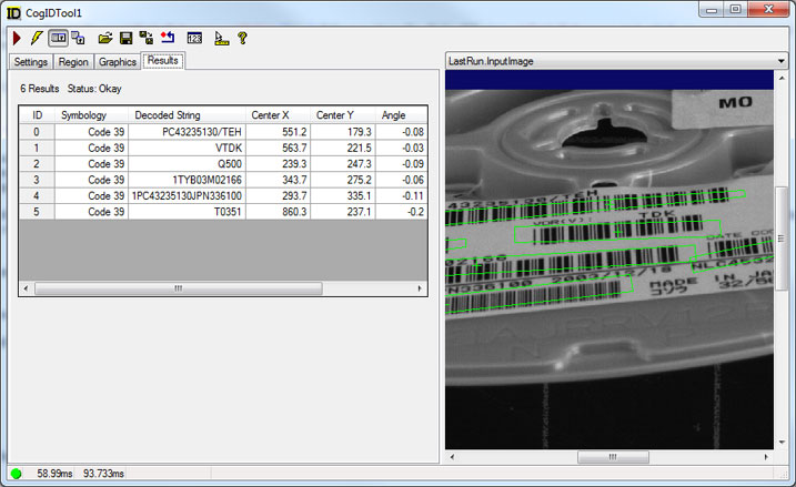 Use the Results tab to view the CogIDResults about each symbol the tool found and decoded. The following figure shows an example Results tab: