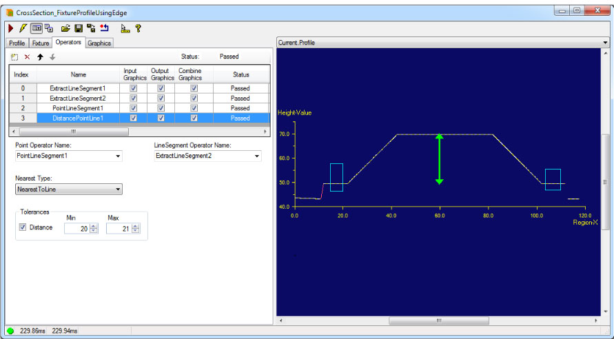 Each Cross Section tool employes a variety of operators on the profile. For example, the following figure shows a set of operators configured to calculate the height between the first plane and the top of the frustrum: