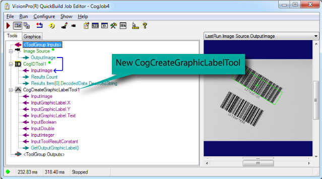 See the topic Using QuickBuild for details on using QuickBuild. A new CogCreateGraphicLabelTool is added to a Job with a set of input parameters ready to accept values from other vision tools in the tool group or tool block, as shown: